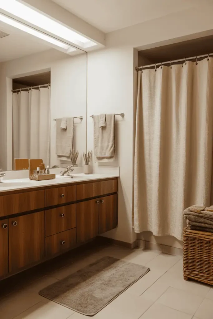 Textiles help bridge the gap between wood and tile. Towels, bath mats, and curtains soften transitions.