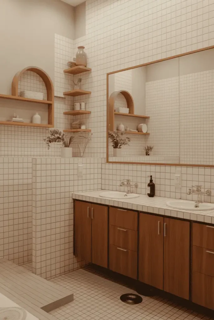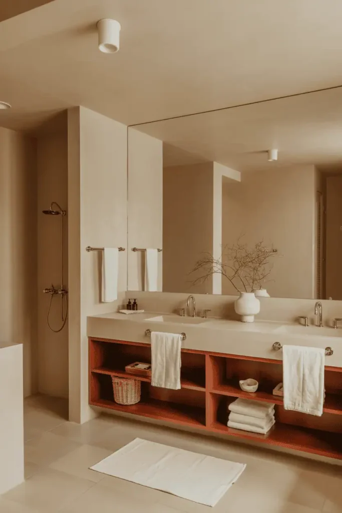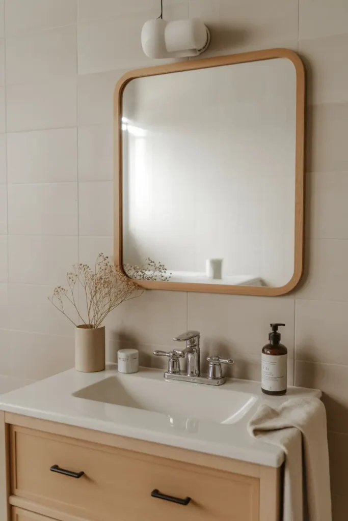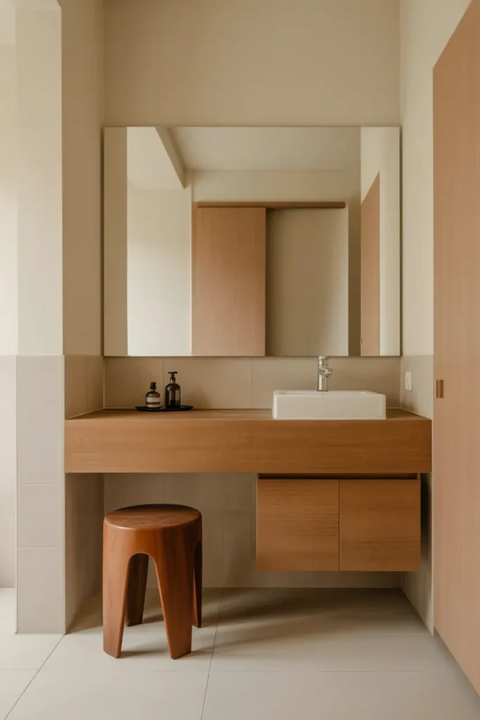 A wooden vanity is often the strongest way to introduce warmth. It anchors the room and gives the eye something natural to rest on.