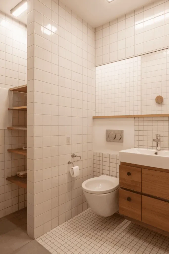 In small bathrooms, restraint matters even more. One or two wooden elements are usually enough.