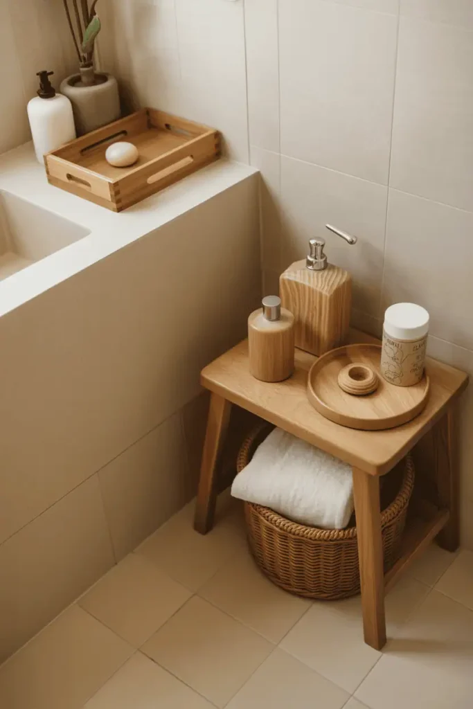 This might mean a wooden tray, a small stool, or a framed mirror. These elements soften the space without overwhelming it.