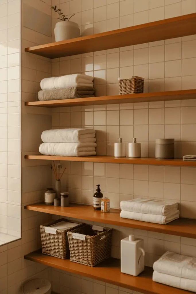 This works well when shelves are used intentionally — towels, baskets, or a few daily-use items. Overloading shelves quickly undermines the calm look.