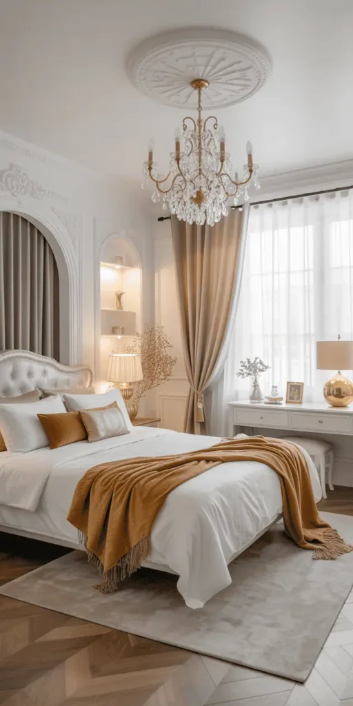 Stylish white and gold furniture is key. Choose a white bed frame with gold legs or a gold-trimmed dresser. Brands like IKEA’s EMPIRE collection or West Elm’s gold pieces offer modern options. A large gold-framed mirror can add drama without taking up space.