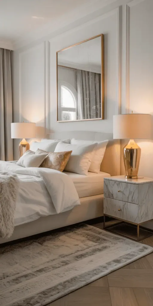 Whether you’re updating one corner or redoing the whole room, the modern white and gold scheme fits any budget. Small investments in the right places can turn even modest spaces into a luxurious bedroom design that feels both cohesive and personal.