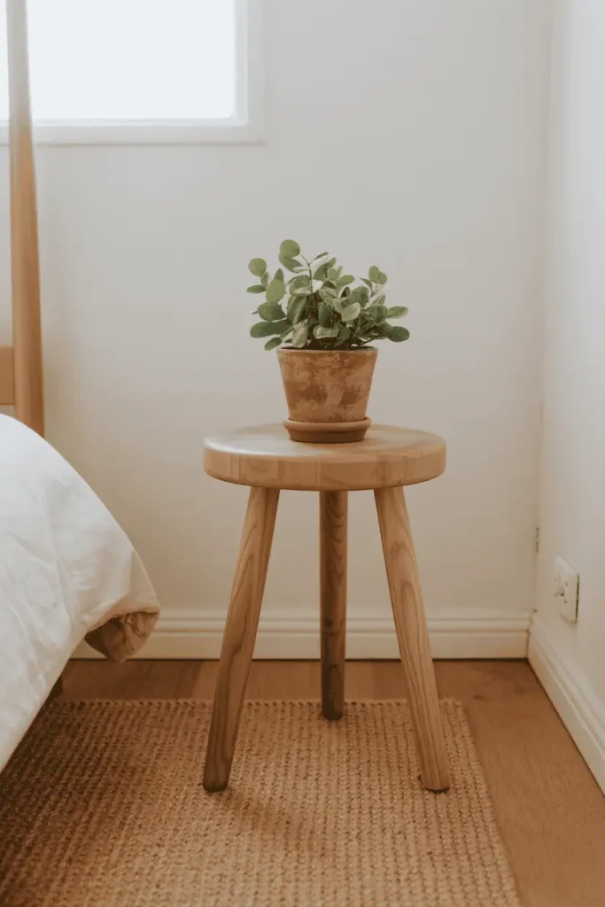 A low wooden stool — something simple, three-legged or cylindrical — works as an occasional side table, a plant stand, or a place to set a water glass at night. It’s adaptable, movable, and it reinforces wood as the room’s primary material without requiring permanent placement.