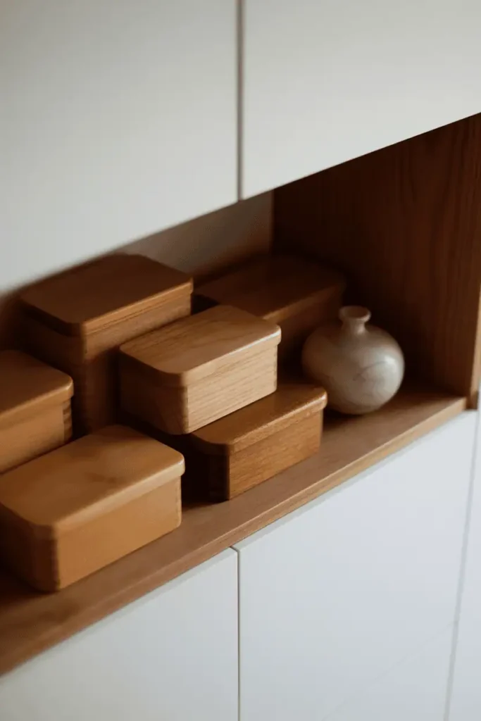 Small wooden boxes with lids — the kind used for jewelry, stationery, or loose items — add function and visual consistency to open shelving. They contain clutter without introducing plastic or metal storage solutions.
