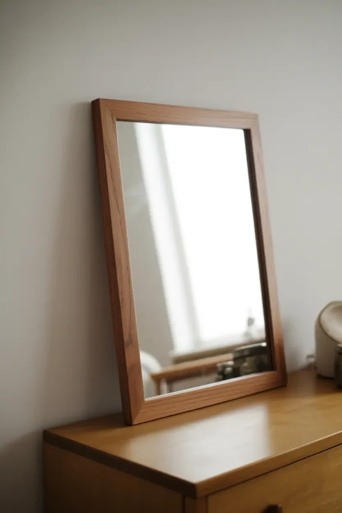 A mirror in a solid wooden frame — rectangular or oval, nothing ornate — reflects light without adding visual clutter. The frame should be proportional: not so thick it dominates, not so thin it disappears. Two to three inches is usually right.