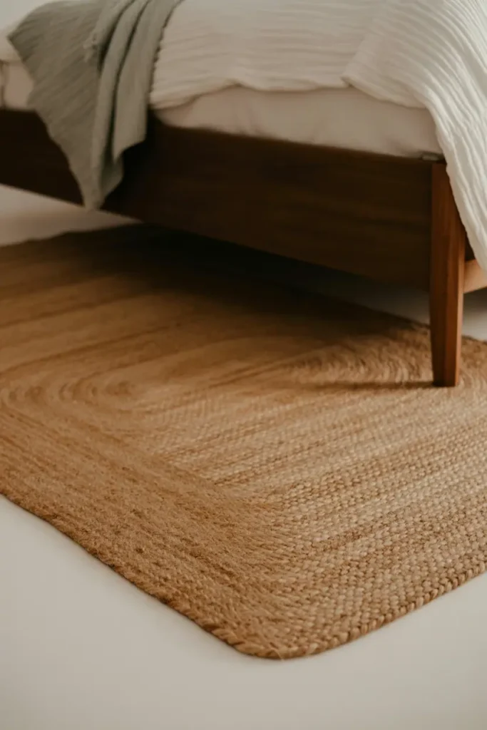 A jute, sisal, or seagrass rug under the bed softens the floor without introducing synthetic texture. These materials work with wood rather than against it — both are natural, both age visibly, both warm up over time.