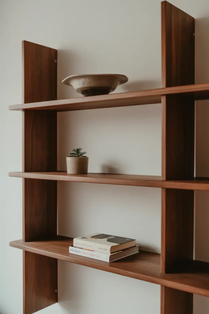Open wooden shelving — whether floating or bracketed — only succeeds when it’s edited. Two or three objects per shelf: a ceramic bowl, a small plant, a stack of books. The wood itself is the material; the objects are just punctuation.