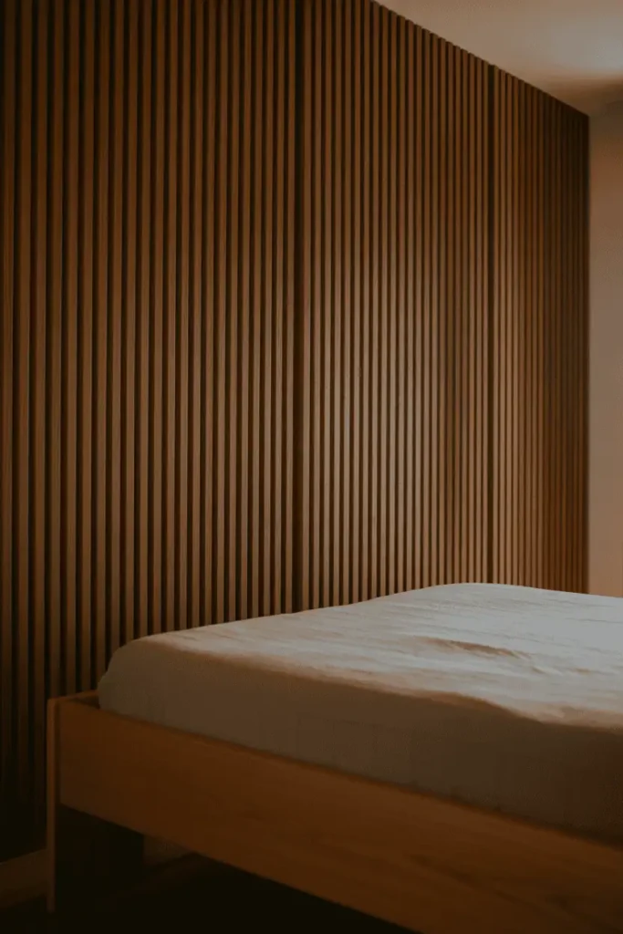 Wooden slats installed vertically behind the bed create depth without adding furniture. The slats can run floor-to-ceiling or just behind the headboard, and they work in both light and dark finishes depending on the room’s existing palette.