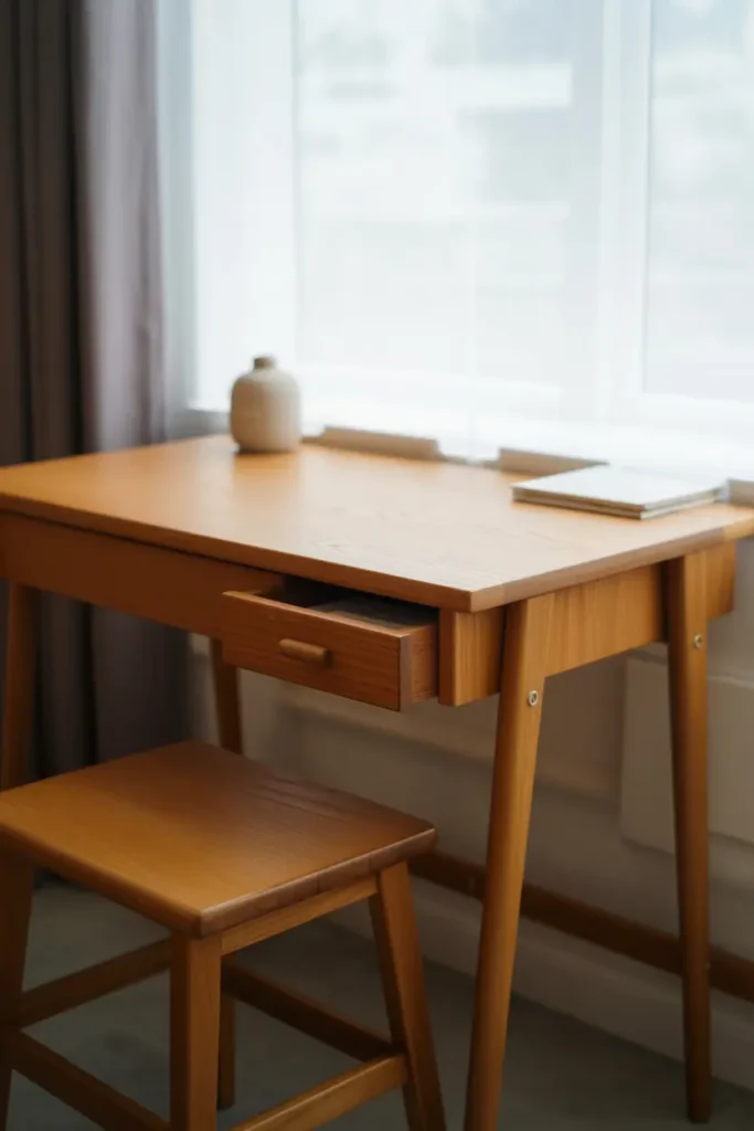 A simple wooden desk or vanity positioned near natural light serves dual purposes: it’s functional workspace and it ties wood into a second area of the room. Choose something with clean lines and minimal ornamentation — a single drawer, straight legs, maybe a lower shelf.