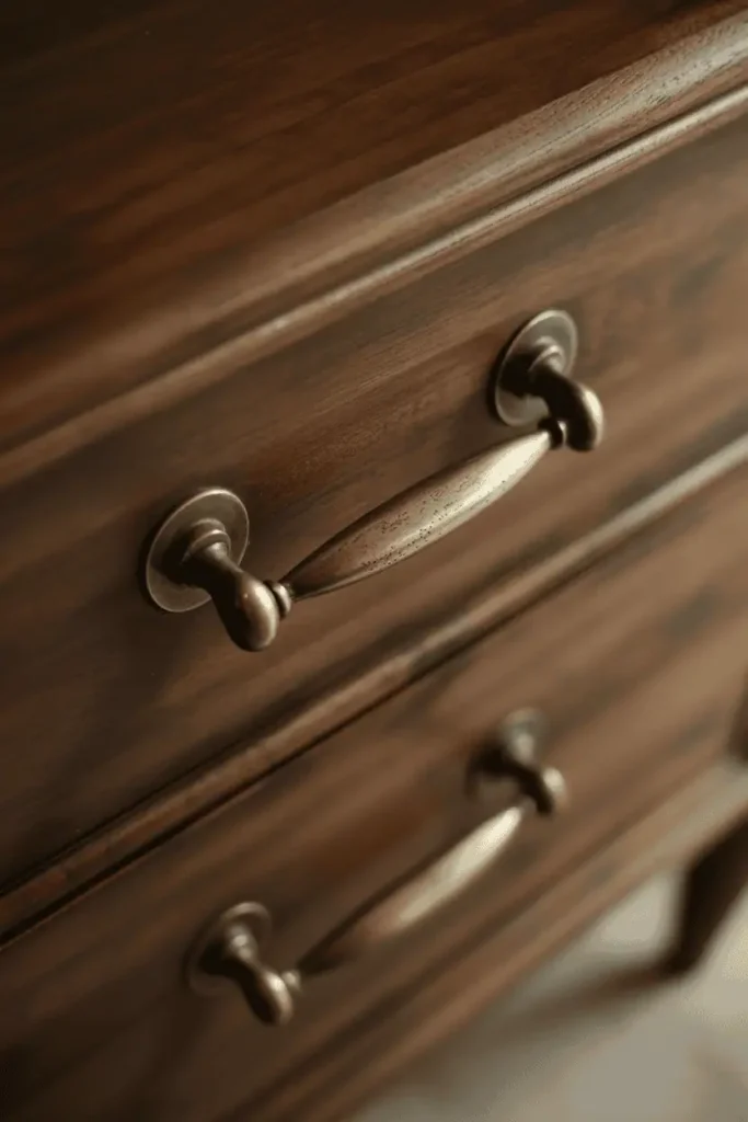 5. Brass or Aged Metal Hardware on Wooden Furniture