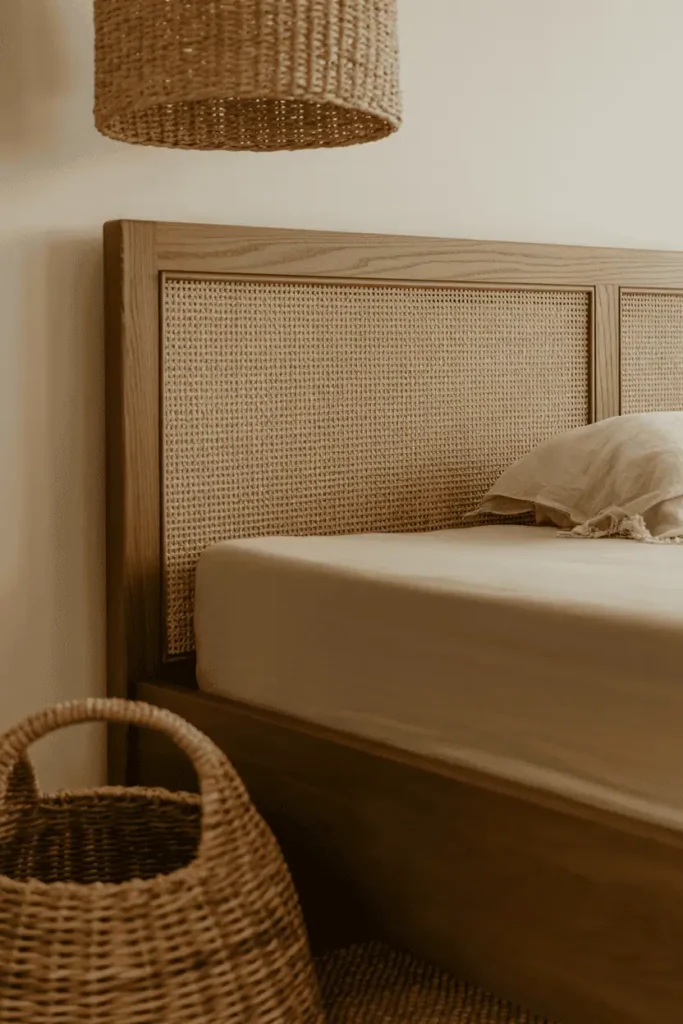 The key is keeping the palette neutral. Natural cane tones sit between light and dark wood, bridging the two without needing additional color. This approach works especially well in bedrooms where you want warmth but not weight.