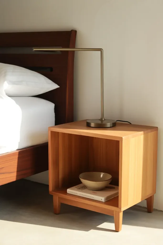 Closed nightstands create visual heaviness, especially in smaller bedrooms. Open wooden nightstands — whether floating shelves with visible brackets or low tables with a single shelf beneath — keep the floor visible and the room lighter.