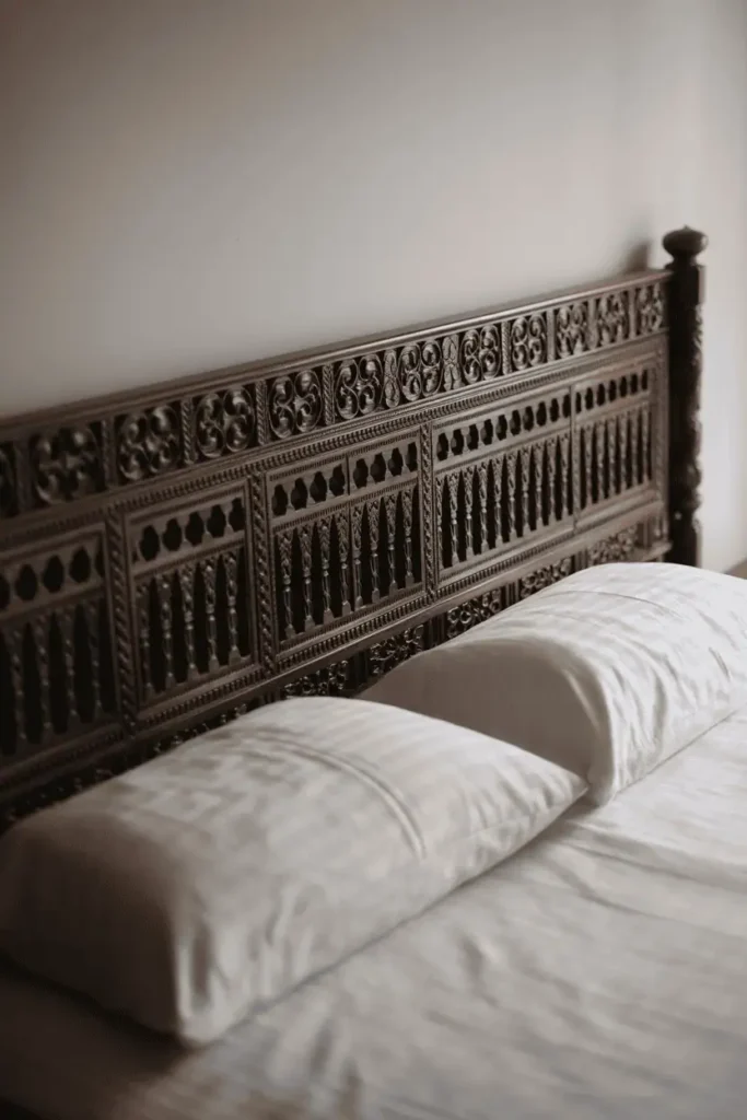 2. Carved Wooden Headboard as the Only Statement