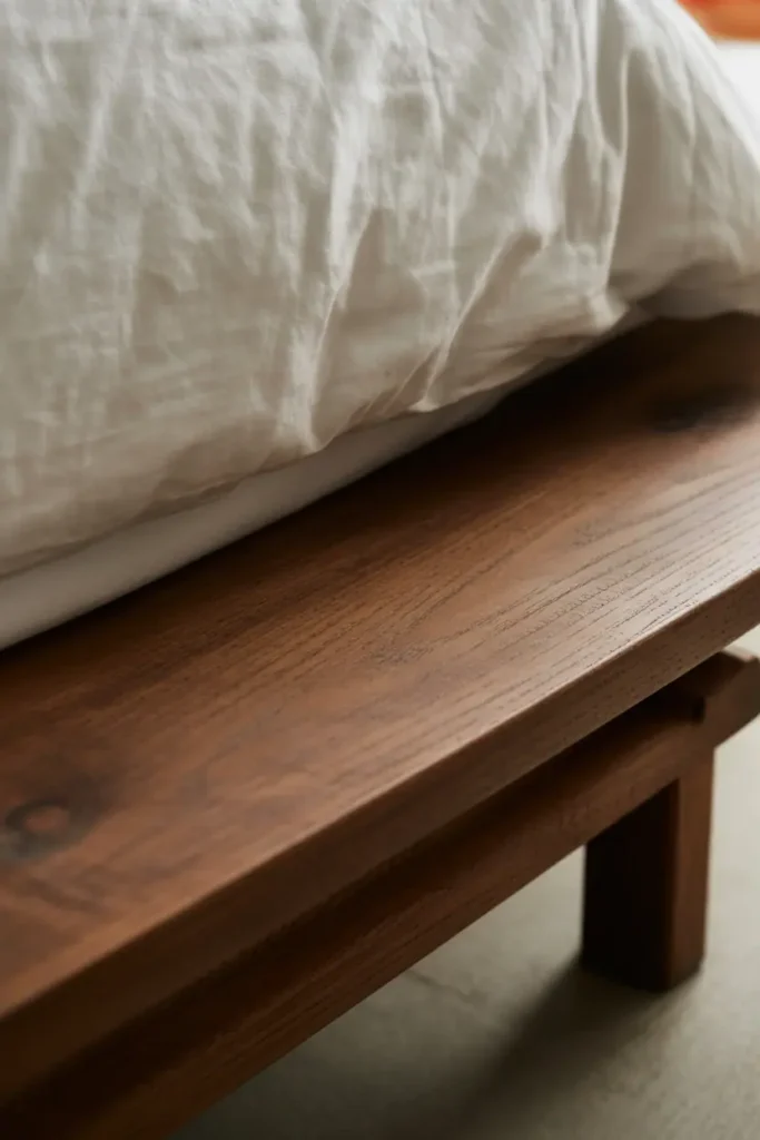 Style note: If the frame feels too spare, add a single wooden bench at the foot of the bed instead of textiles. It extends the wood presence without cluttering the sightline.