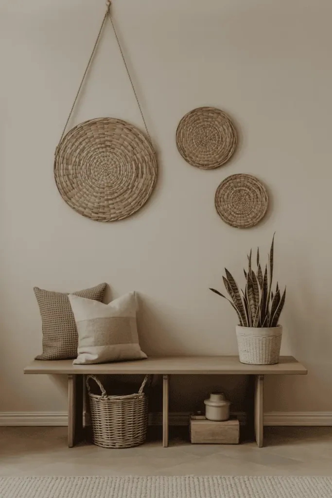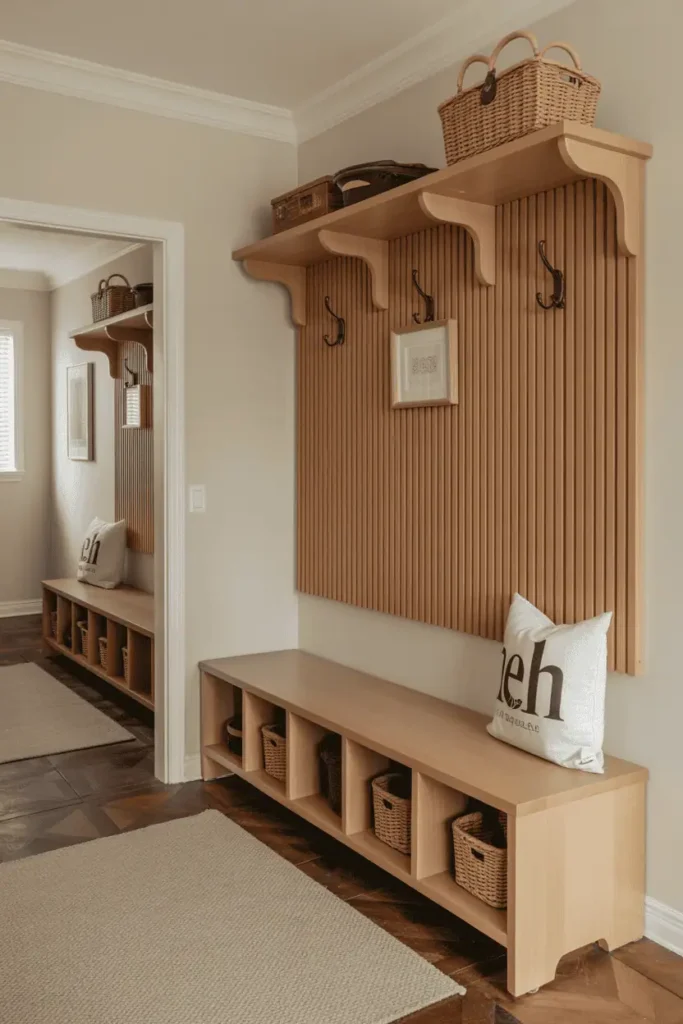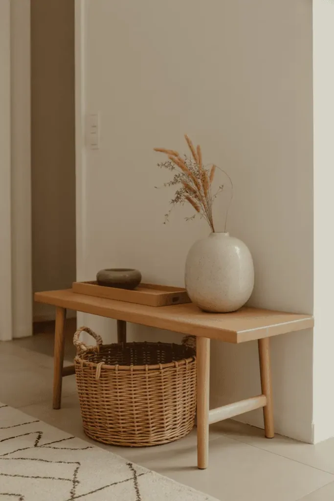Low wooden elements—benches, shoe shelves, baskets—help entryways feel grounded.