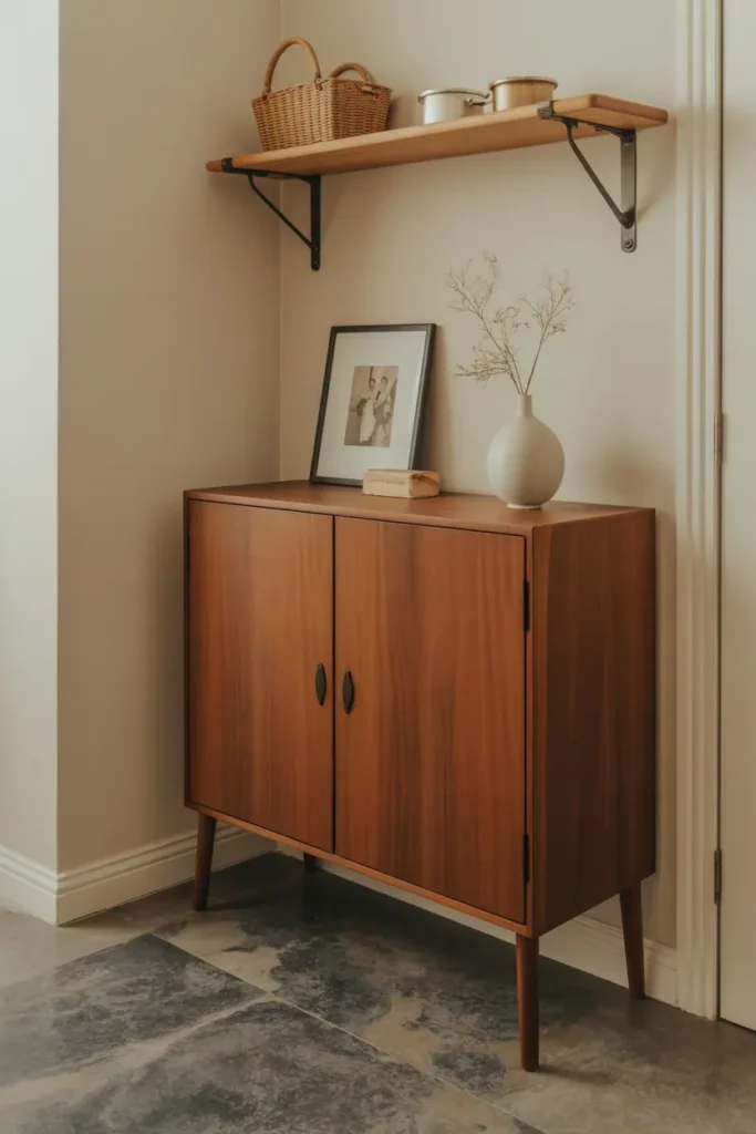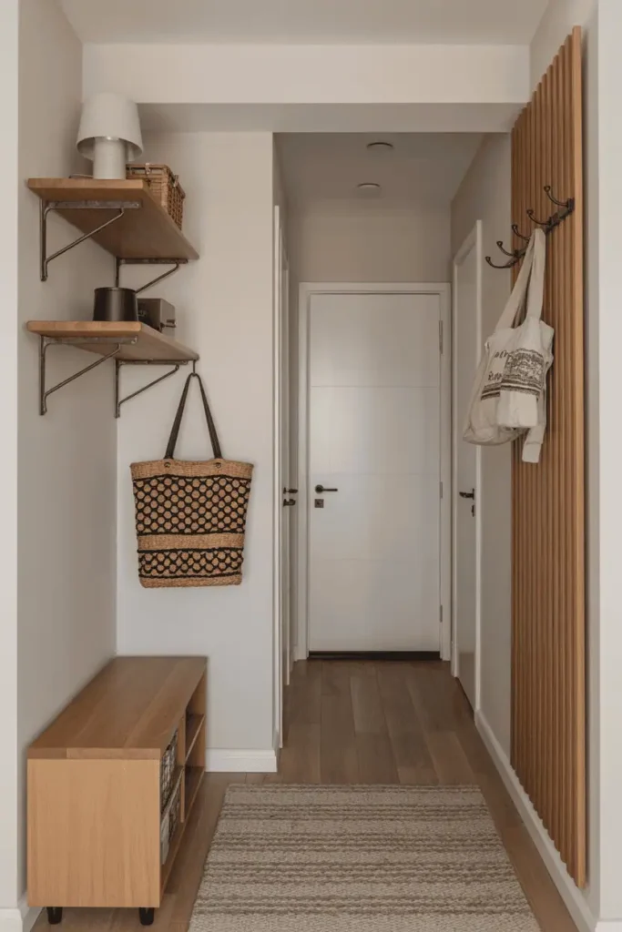 Entryways benefit from vertical elements. Wall-mounted wood shelves, peg rails, or slim cabinets draw the eye up and help balance narrow spaces.
