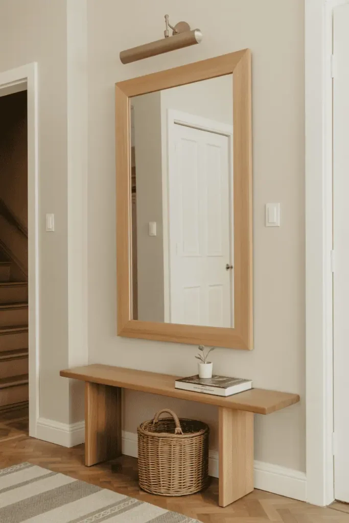 Mirrors are common in entryways, but wooden frames make them feel integrated rather than decorative.