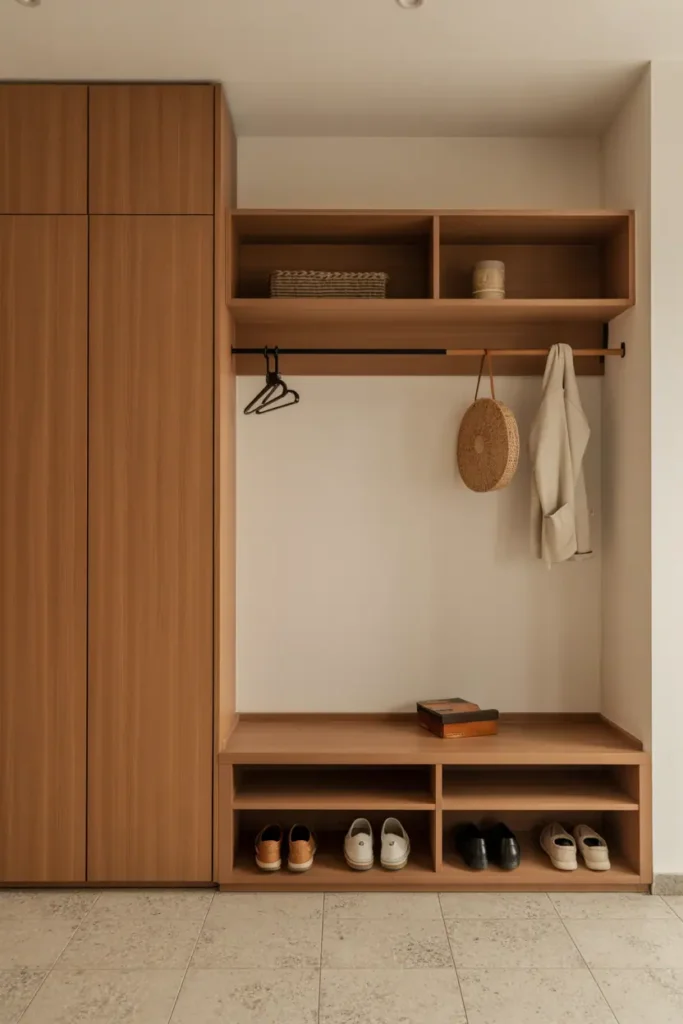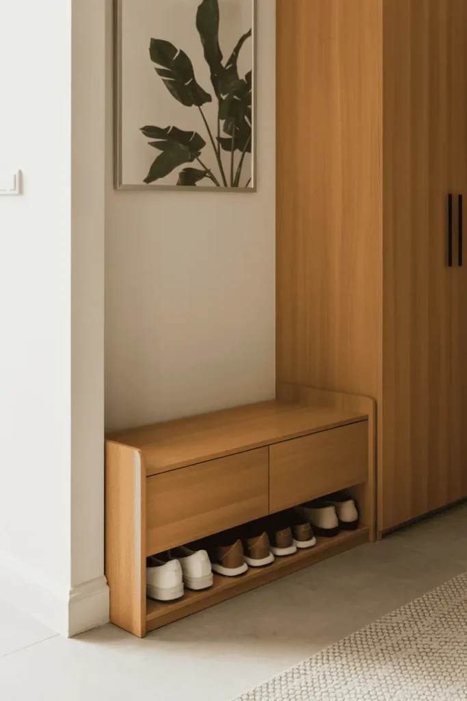 Shoe storage is essential, but it doesn’t need to lead the room. Low wooden shoe benches or cabinets keep shoes contained without becoming the focal point.