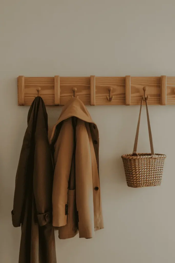 Hooks are practical, but not all hooks belong in visible spaces. Wooden hooks or peg rails soften the look and feel more intentional than exposed metal hardware.