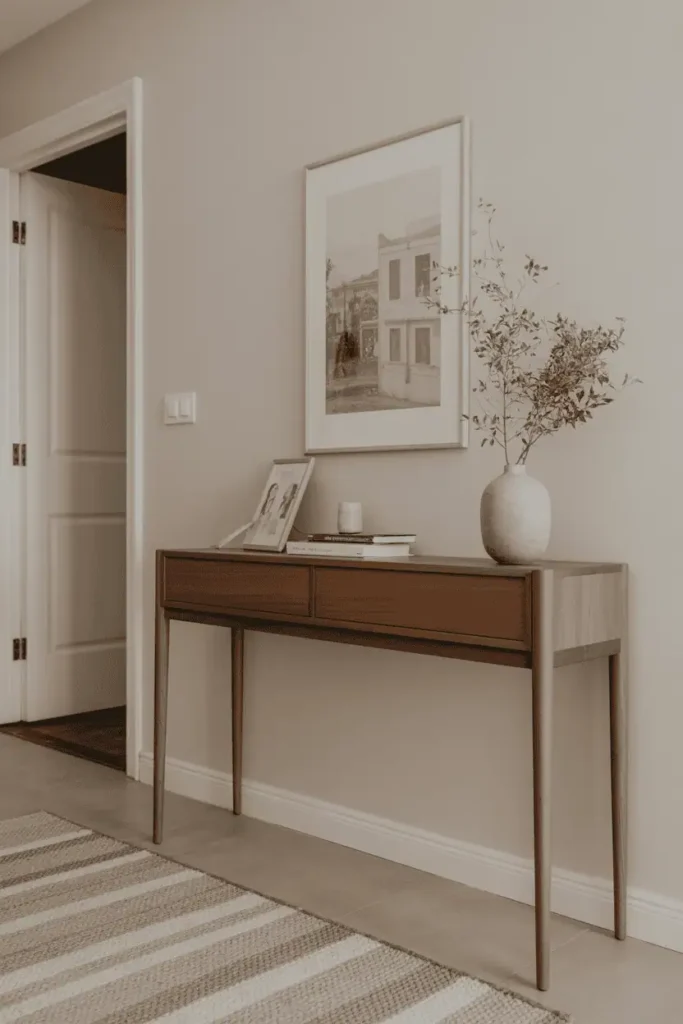 Console tables are ideal when you need surface space without depth. A wooden console keeps keys, mail, and small items contained without turning the entryway into a drop zone.